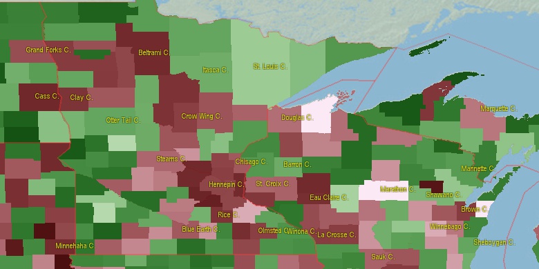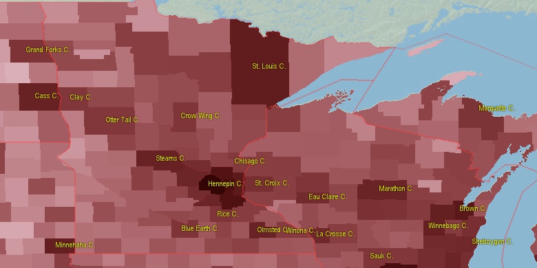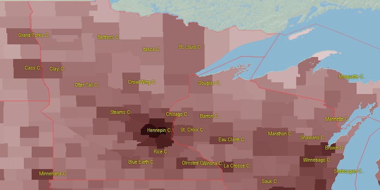 Last official estimated population of Carlton County was 35,410 (year 2014)[1]. This was 0.011% of total US population and 0.6% of total Minnesota state population. Area of Carlton County is 875.3 mi² (=2267 km²), in this year population density was 40.46 p/mi². If population growth rate would be same as in period 2010-2014 (+0.02%/yr), Carlton County population in 2026 would be 35,482 [0].
